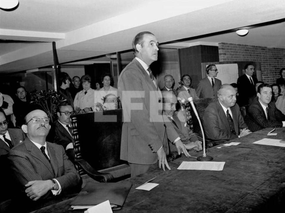 Junto a la publicación de la fotografía se lee: «Madrid, 18-5-1971.- El ministro de Industria López de Letona (de pie) junto al titular del INI, Claudio Boada (iz), y el presidente de las Cortes, Rodríguez de Valcárcel (3 iz), ministro de Vivienda, Mortes y el vicepresidente del INI, Amasátegui; durante el acto de inauguración de 84 viviendas en Parque Marqués de Suanzes en la carretera de Aragón.«.